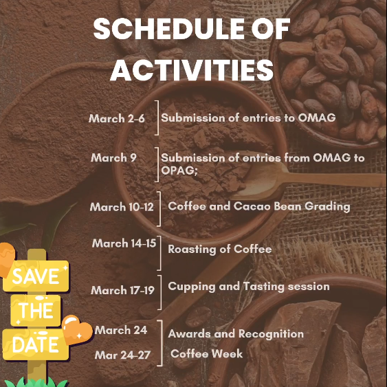 Winners will be announced during the Coffee Week Celebration on March 24–27 at the Provincial Capitol lobby and Palispis Hall in La Trinidad.