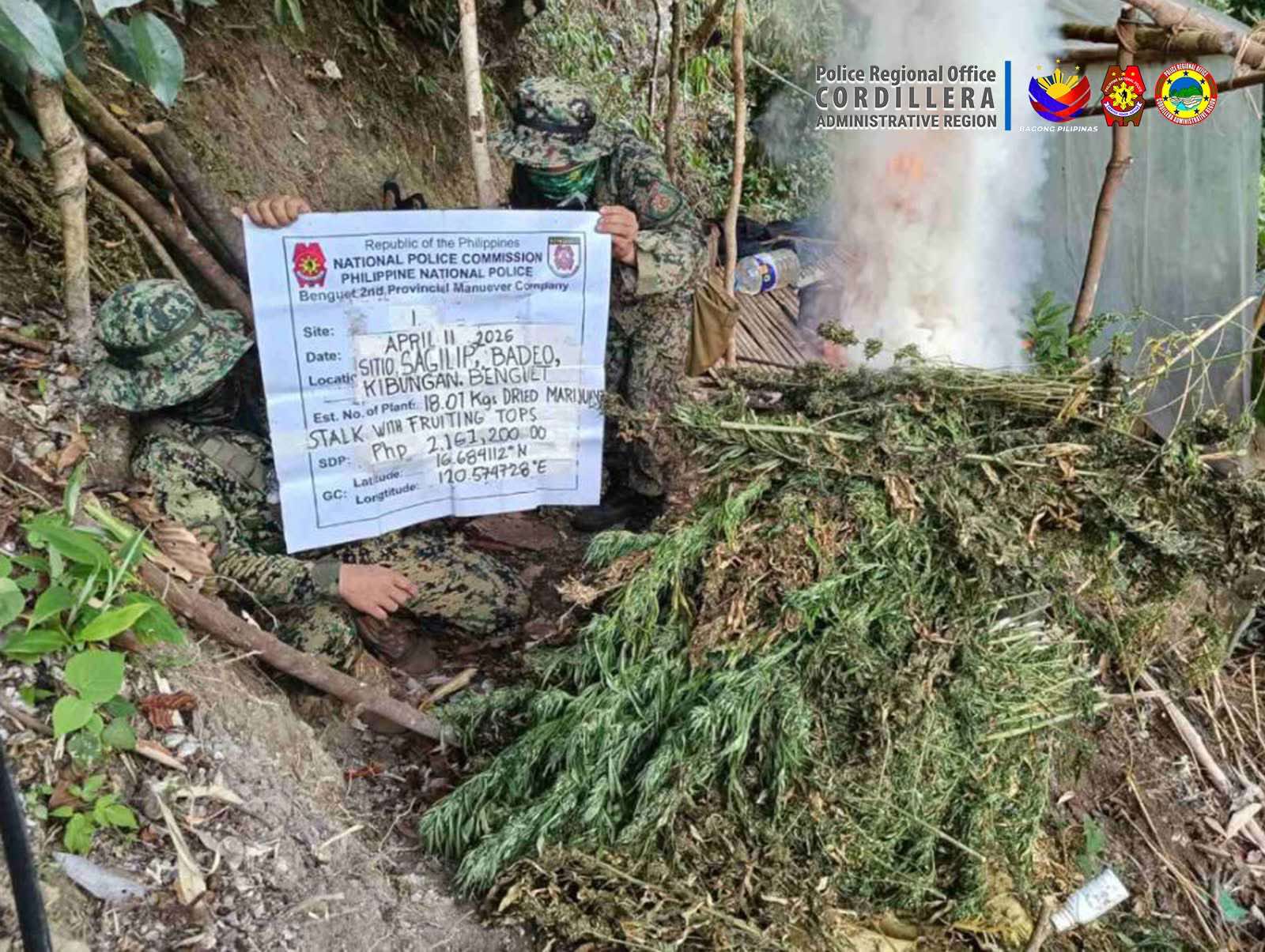 BENGUET, Philippines — Police in the Cordillera Administrative Region (CAR) said they seized an estimated PHP 3.49 million worth of marijuana and arrested a suspected cultivator during separate eradication operations conducted in Benguet province on April 11, 2026.