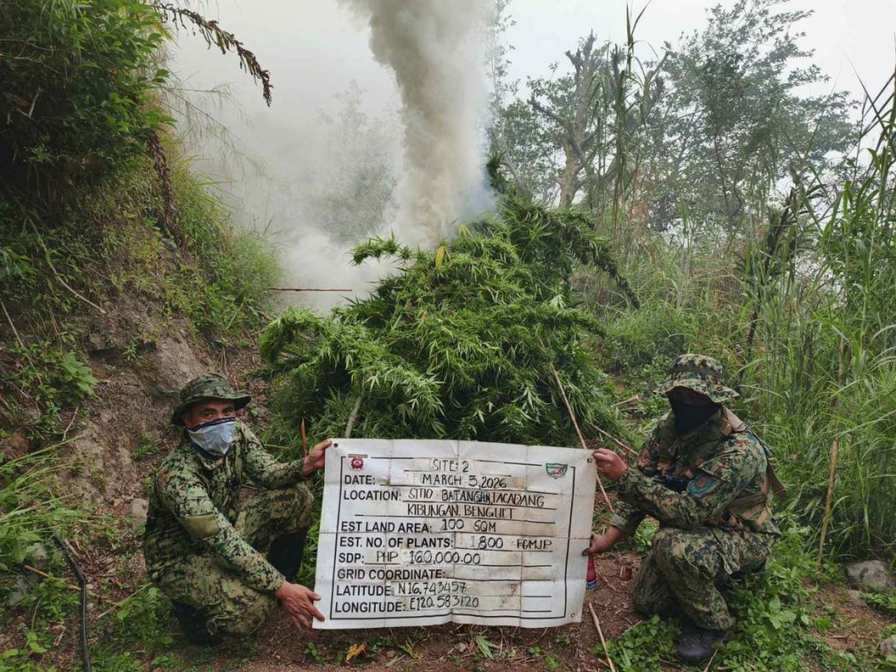 The plantations were located in Kibungan, Bakun, and Kapangan, municipalities in Benguet province known for rugged terrain where illegal marijuana cultivation has periodically been uncovered.